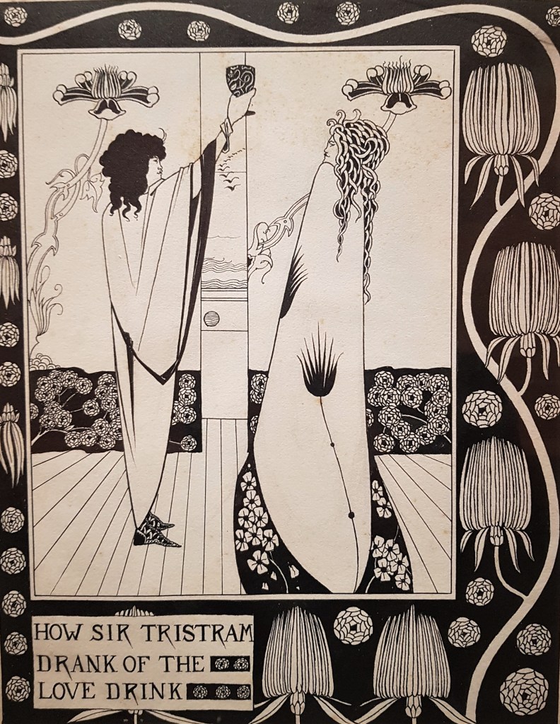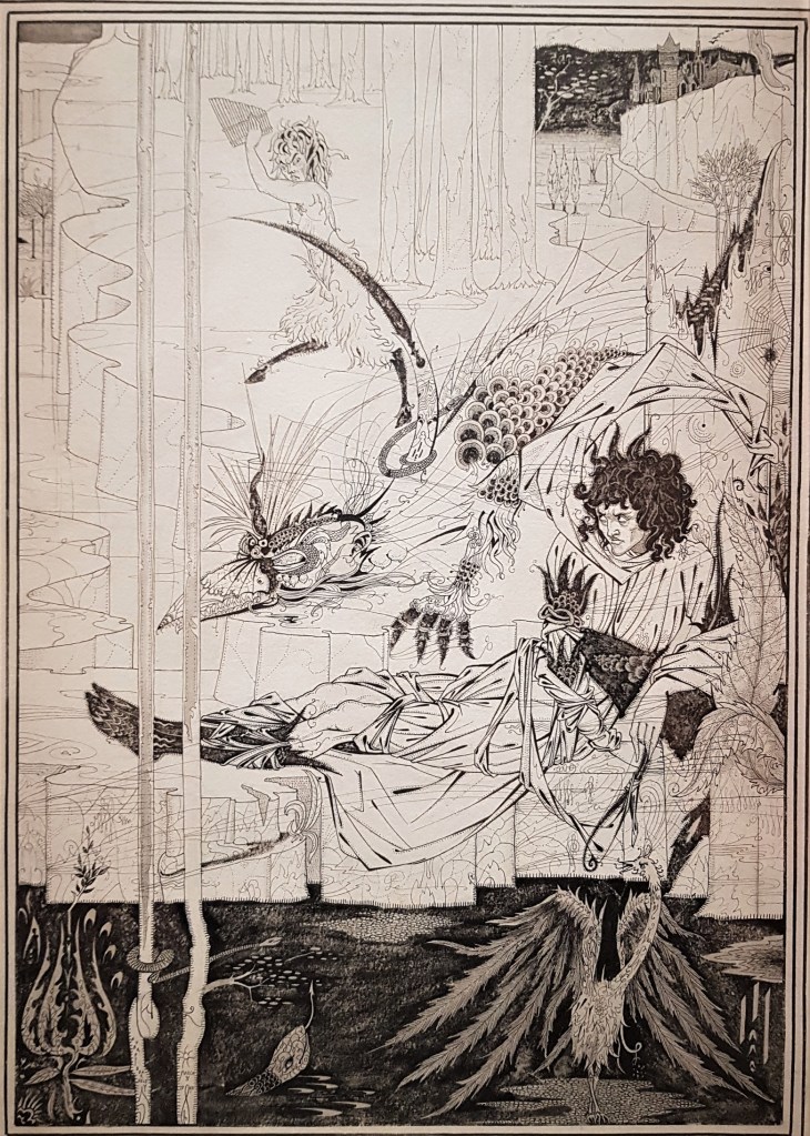 His first major commission was the illustrations for the Death of Arthur, a medieval text, that offered 3 times his salary and thus he was able to quit his day job. This project occupied him for 2 years producing over 350 drawings, unfolding his influences and their very modern interpretations. Profiles are Pre-Raphaelite, compositions and formats are borrowed from Japanese woodblock prints, exotic animals are drawn from the Chinoiseries, borders remind us of the Japanese katagamis (stencils), expressions are created by a contrast of black and white as admired in the Greek Pottery of the British Museum, the ‘hairline’ style is borrowed from Art Nouveau. All of the above is invaded by decorative motifs providing cohesion among the often unrelated episodes, figures or contexts. Lines exist in a decorative profusion, renderings are extremely varied, details are strange. Actually, the more we look, the more we see. He introduced endless possibilities to the illustration of books, making it a parallel art to literature, launching this way the 20th C graphic creation.