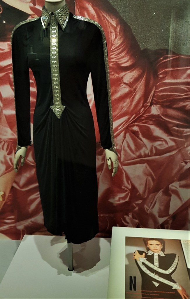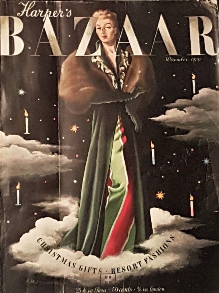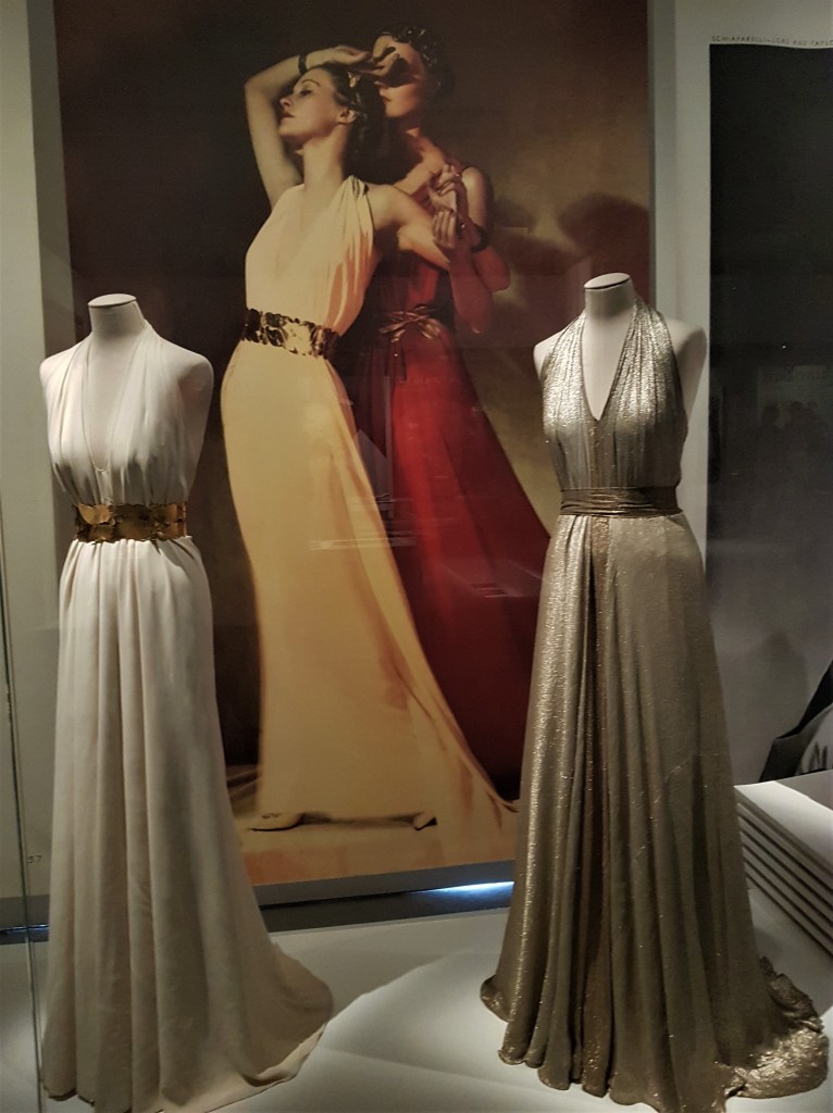 The second period stretches from the First World War to the late 30s. William Hearst, the all-powerful, press magnate bought the magazine, hired Erte, the most avant-garde graphic designer for the covers, while photography, that had appeared in the inside pages, was signed by Alfred de Meyer and Man Ray. These are the roaring 20s, women adopted the garçonne style, had the bob cut, and skirts were short enough for dancing. Dazzling dresses by Paul Poiret and Jean Lanvin are on display, as well as one by Coco Chanel, who had just started her business, along with its picture on Harper’s Bazaar. Photography was black and white, so fashion had to produce photogenic dresses to be printed in the press.