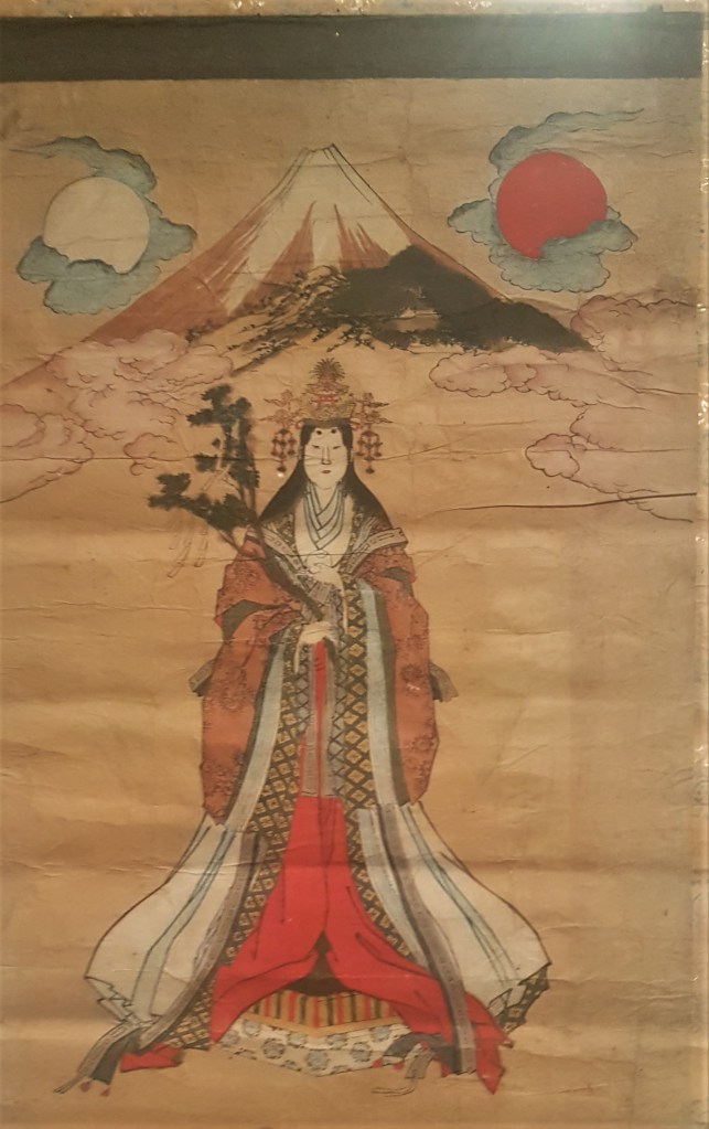 Woodblock prints were developed in Japan from the 17th C. onwards, but painting existed long before; the first representations of Mount Fuji are dated in the 9th C. Its summit and slopes are populated by gods and spirits, while shrines all the way to the top make it a sacred pilgrimage site. The goddess Konoha Sakuya Hime depicted above, is the blossom-princess and symbol of the fragile life but also the goddess of all volcanoes, including Fuji.