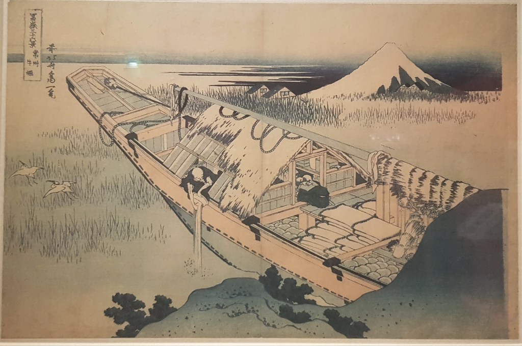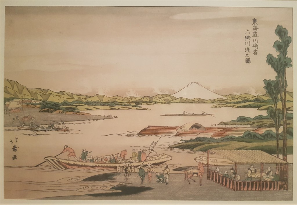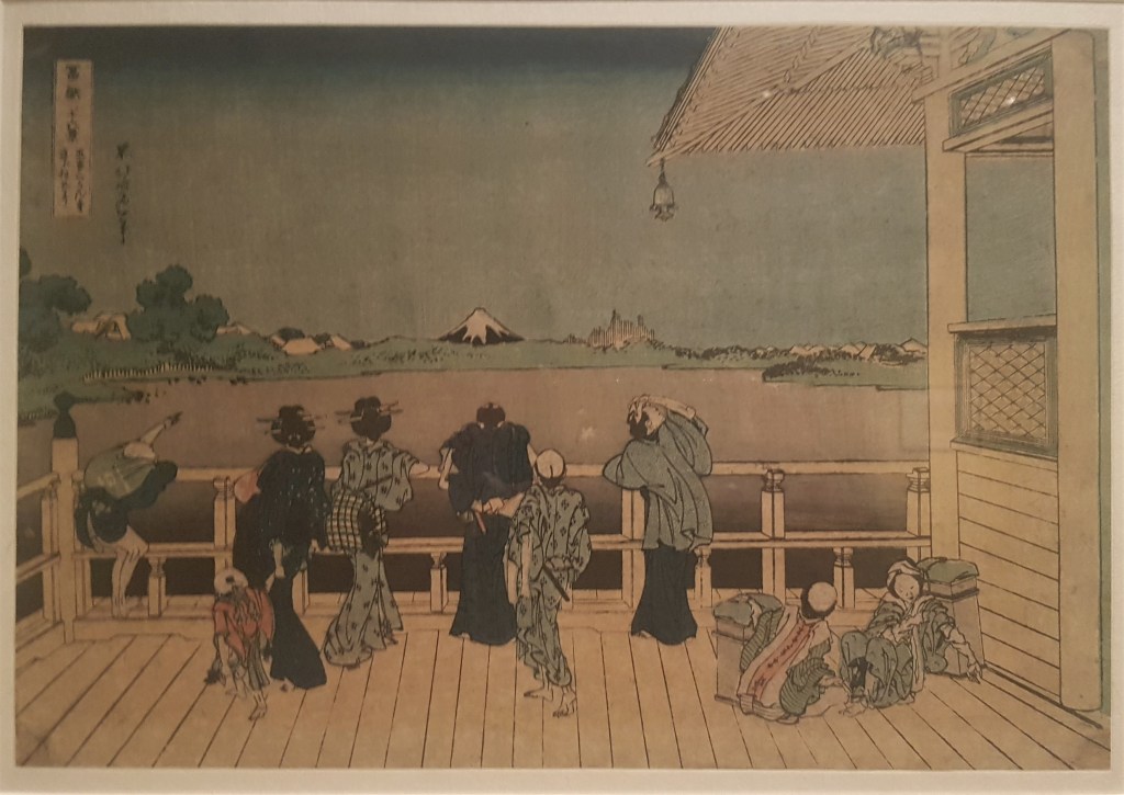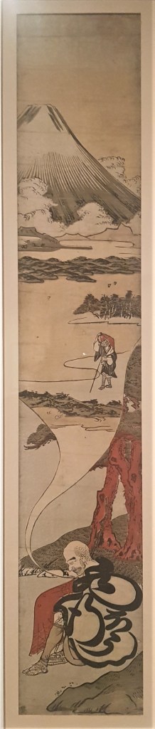 The Edo period, named after the capital of the Shoguns (modern Tokyo), lasted two and a half centuries (1603-1868) and brought stability but also seclusion. Japan became a closed country, no one was allowed to enter or exit under punishment of death. An urban society of merchants was developed due to the economic growth of the main cities, along with their own culture of pleasures including theatre, tea ceremonies, sumo wrestling and woodblock prints. Woodblock prints, called ukiyo-e, literally translated as images of the floating world, depict the society’s pleasures, from actors and geishas to travel scenes and landscapes. In the print above, Mount Fuji appears in the dream of a monk, and dates from the early period when nature featured in art rather as the background than the main theme.