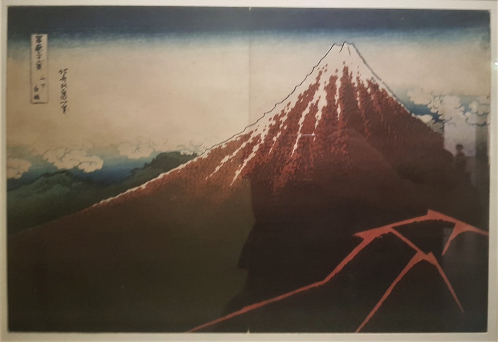 Another masterpiece by Hokusai, depicts the perfect shape of Mount Fuji in the simplest manner and in perfect balance with the cloudy sky. The title specifies the fine, or south, wind of early autumn, and indeed, on sunrise, Fuji turns red. The colours of the sky are reflected on the slopes while the first snow crowns the top.