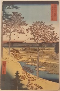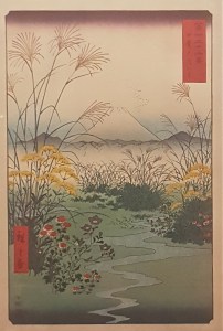 Mount Fuji is visible from many locations and features in the background of various compositions as an element of the landscape. The goal of the artists is not a faithful rendering but rather the acknowledgement of its presence and a way to pay their respects. Hiroshige, the last great master, contemporary and rival to Hokusai, produced a more figurative, colourful and narrative art, with humans, animals and plants occupying a prominent place, while Fuji in the back is putting each scene in context. He also produced his own 36 views of Mount Fuji, a generation after Hokusai.