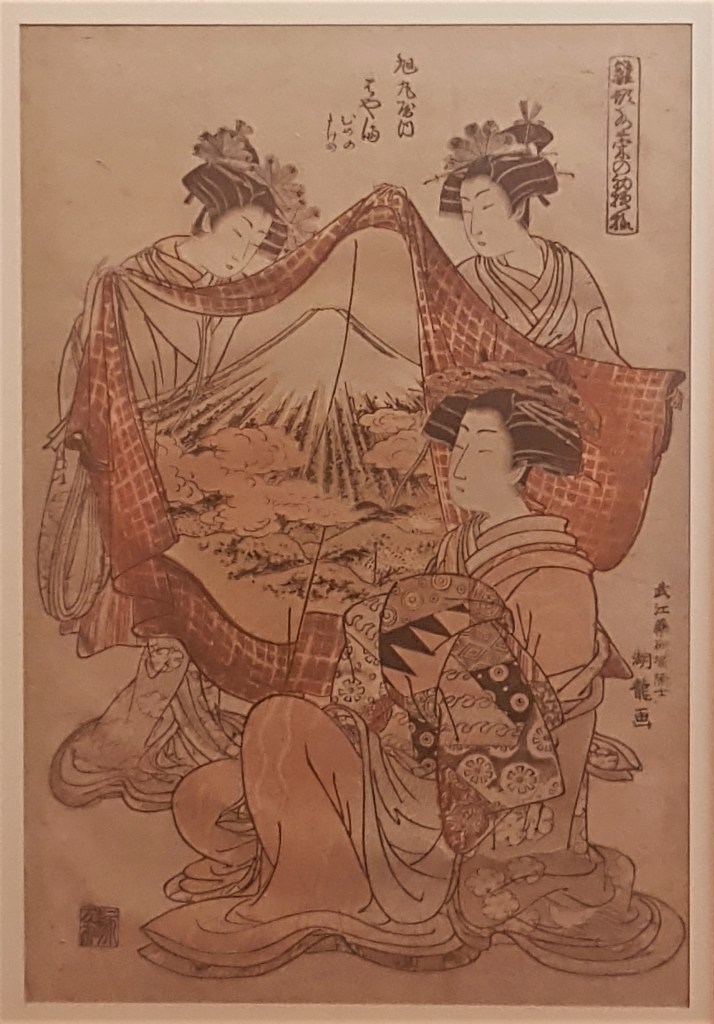 The exhibition also explores the presence and meaning of Mount Fuji in other kinds of compositions. For instance, in the print above, a group of courtesans admire the latest fashion, entirely gracious and pious towards another fundamental Japanese art, textile printing, with a fabric sample featuring Fujisan as a motif.