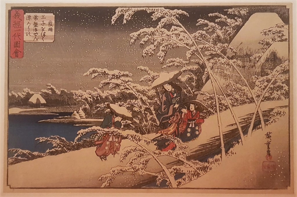 The exhibition includes snowscapes in Japanese prints beyond Mount Fuji. In this section, humans are confronted to the harsh winter conditions, challenged by nature, always in self-restrained, undramatic postures while the spirits are invisibly present. Some more pictures by Hiroshige are on display. Although relations were not established yet with the rest of the world, Hiroshige had access to some rare art books imported in Japan. In the landscapes above it is interesting to observe an attempt to apply the rules of perspective. At the same time, technique-wise, the artist fully exploits the whiteness of the paper making it the essential element of the composition. Europeans, once in contact with the Japanese prints, would discover the force of the void and emptiness. As a consequence, the overcharged art styles of the time will make way to the Impressionism and the Art Nouveau.