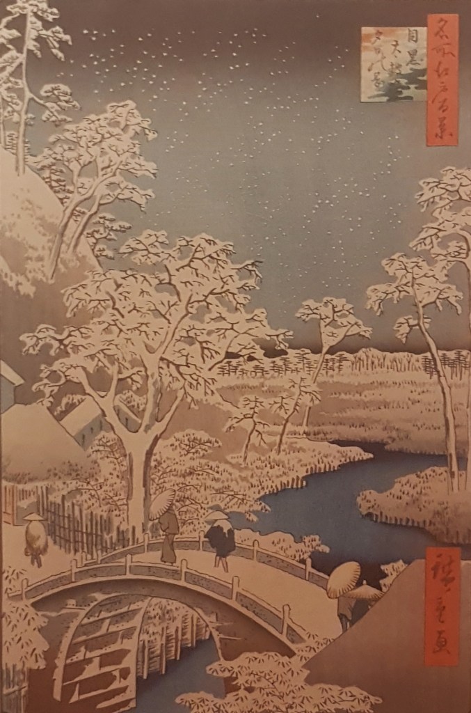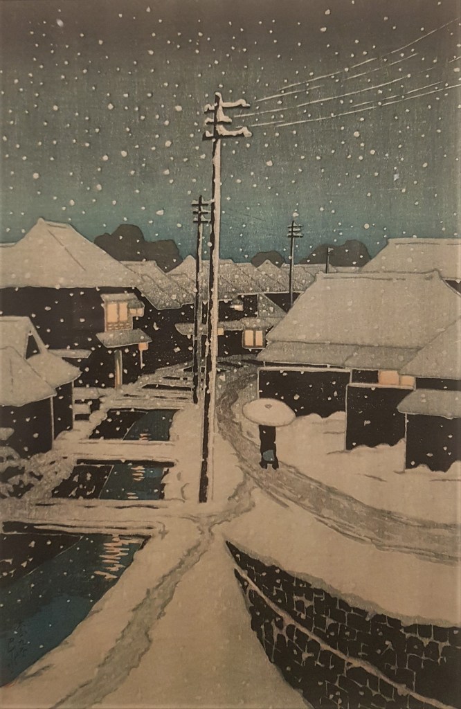 The Meiji era ended in 1912 and Japan progressively reconciliated with its traditions, especially after the humiliating defeat of the Second World War. An equilibrium settled, with an extreme modernity and a proud acknowledgment of its identity. In Hasui’s works, the great master of snowscapes in the 20th C, we can fully see this shift in the arts. In 1920, the perspective could not be more European, reflecting progress. 30 years later, and after the trauma of the war, the progress is still here, the figures are dressed fashionably. At the same time, the scene is dominated by an impressive and imposing red temple, while the snow washes away in silence the contrast to give birth to contemporary Japan.