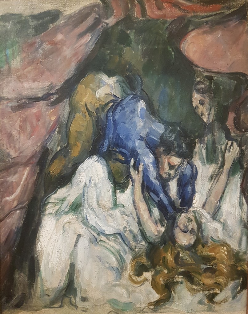 The Murder is another image of violence, constructed by colour and depicting light reflections on complex surfaces, enhanced by the figure of the helpless victim. The whole becomes more dramatic by the diagonals, the strong primary colours and the emotion. Once again, the composition and the power of colour can be associated to Tintoretto’s The Deploration of Christ. Cezanne constructs images in sheer contrast to the dominating Academic Art of his times which produced paintings as copies of classical statues.