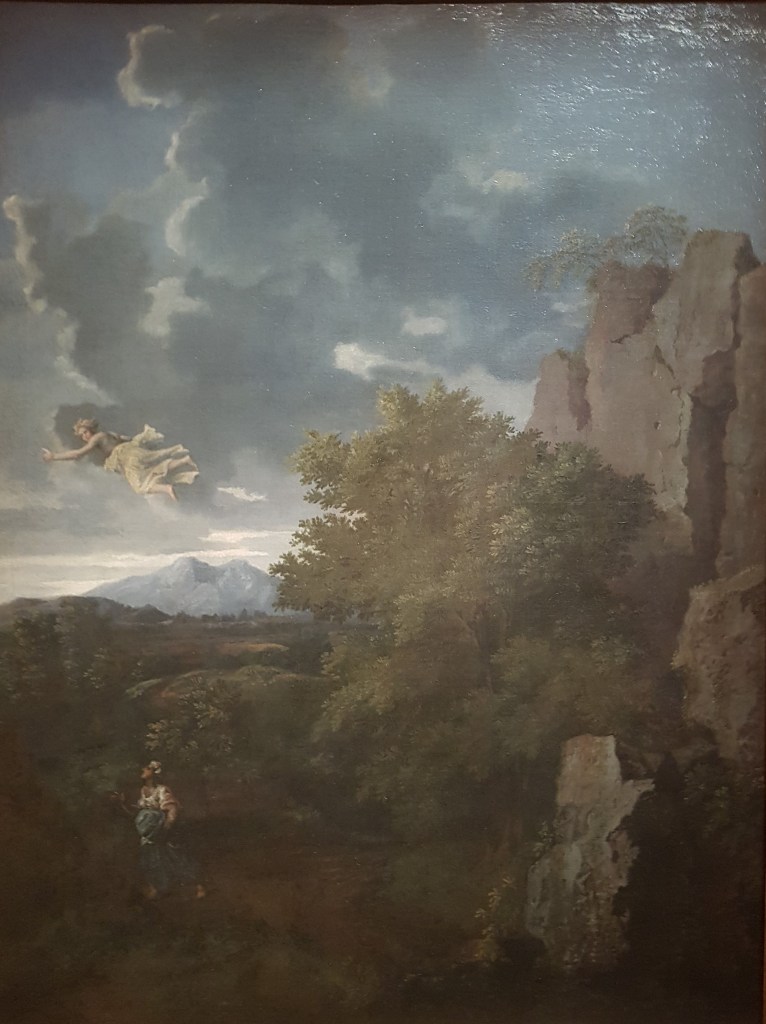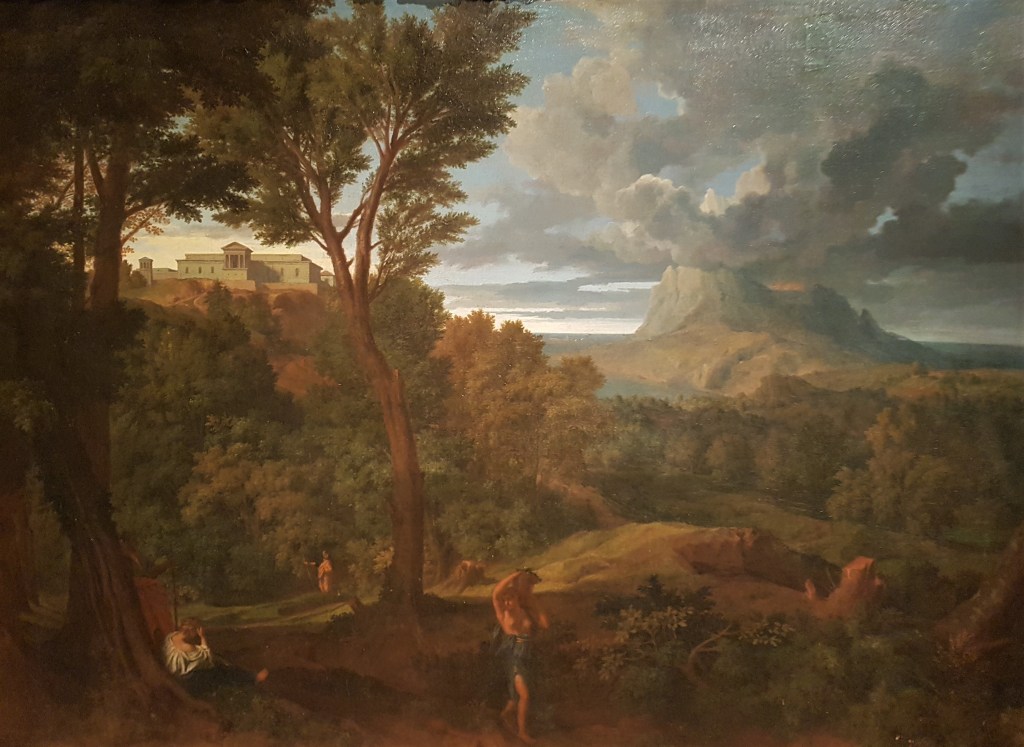 The mount Sainte-Victoire, overlooking Aix, would become an obsession for Cezanne. Since a young age, he felt curious about the earth sciences, especially geology. Minerals and rocks represented for him the absolute origins, well before life began. The mass of the mountain is also a reminder of God, as it rises to the sky. He began painting it after the death of his father in 1886. In his first attempts he sticks to the usual landscape principles, as resumed in Millet’s Classical Landscape, that he must have certainly seen when in Marseille . He would continue painting the mountain until the end of his life, analyzing it in a way that colour and shape overtook any other reference. His conclusions on rendering the mineral aspect of things, would be applied to other compositions like in one of his very last works, the Chateau Noir. Without any notion of perspective or depth, Cezanne dismisses Western art and comes up with a rendering like a geological stratigraphy that reinforces the contrast and the unison between natural and manmade elements. Next to it, the Landscape by Poussin demonstrates the interest of past masters in rocks, but only painted from memory and sketches with figures as a narrative pretext, but likewise in an opposing harmony with the environment.