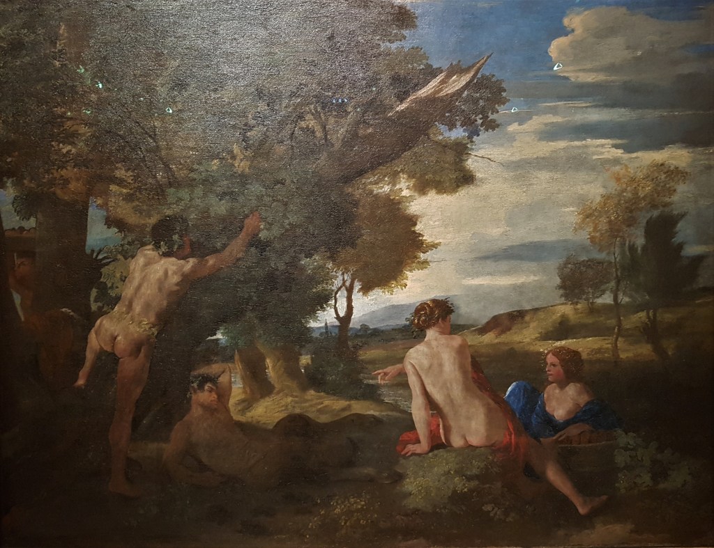 Although attracted by the Baroque emotion, Cezanne drew from Classicism the precision of lines, postures and gestures towards his quest for the truth of nature. In the two paintings above by Poussin, we find the same correspondence between human figures and natural shapes, organized in vertical and horizontal lines, with an opening in the middle that become only more obvious after having spent a few moments in front of Cezanne’s. Cezanne does not apply the geometric rules but he achieves a similar notion of depth. Here are two artists dealing with the outdoors; the first one establishing the “classic” notion of it, the second launching its “modern” aspect leading to Cubism. We could argue that Poussin’s paintings function as a perfect landscape that Cezanne is free to interpret in the same manner that the Impressionists paint in situ their impressions of natural landscapes.